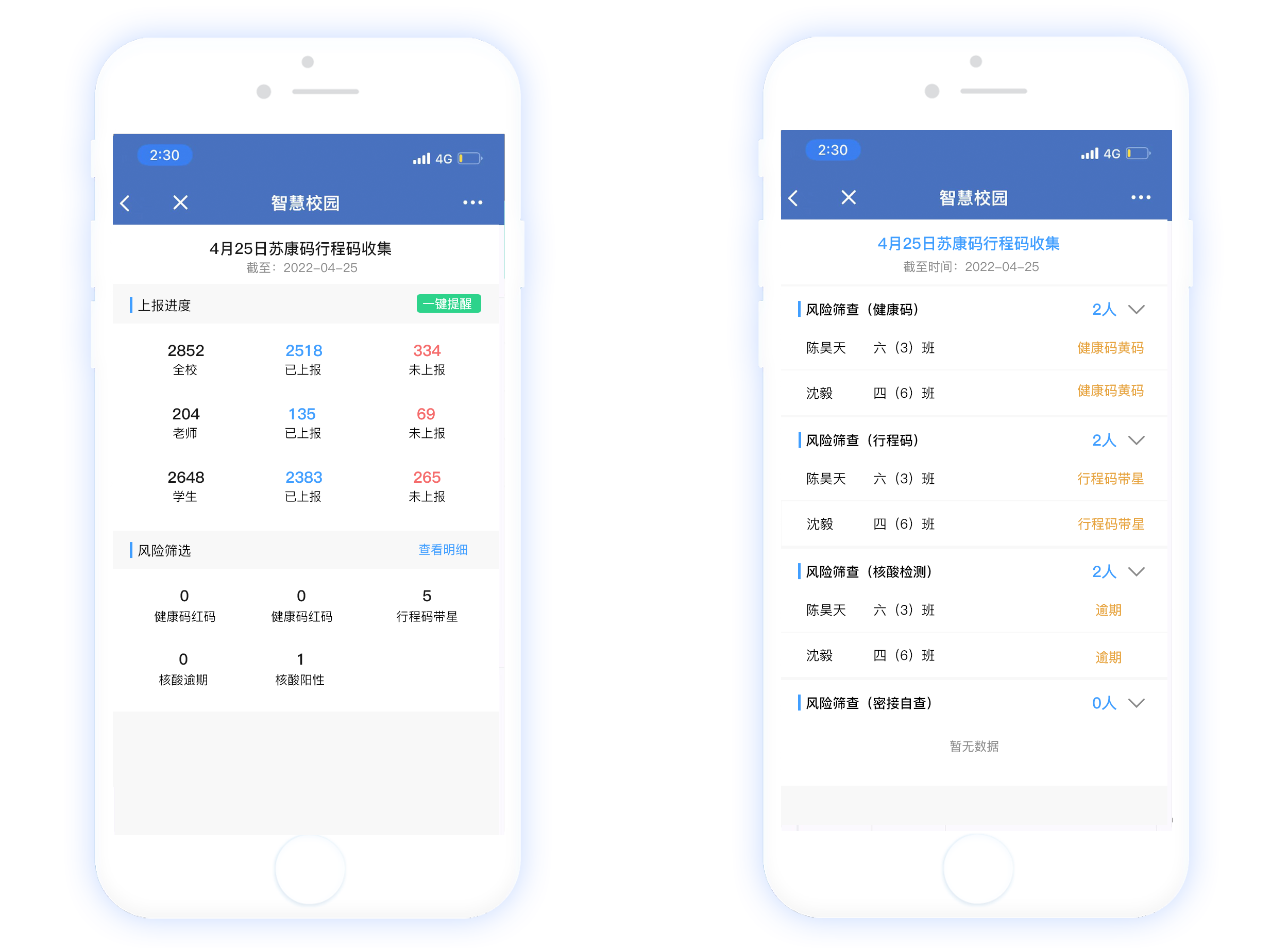 支持實時(shí)查看(kàn)全校(xiào)師(shī)生(shēng)的(de)上(shàng)報進度