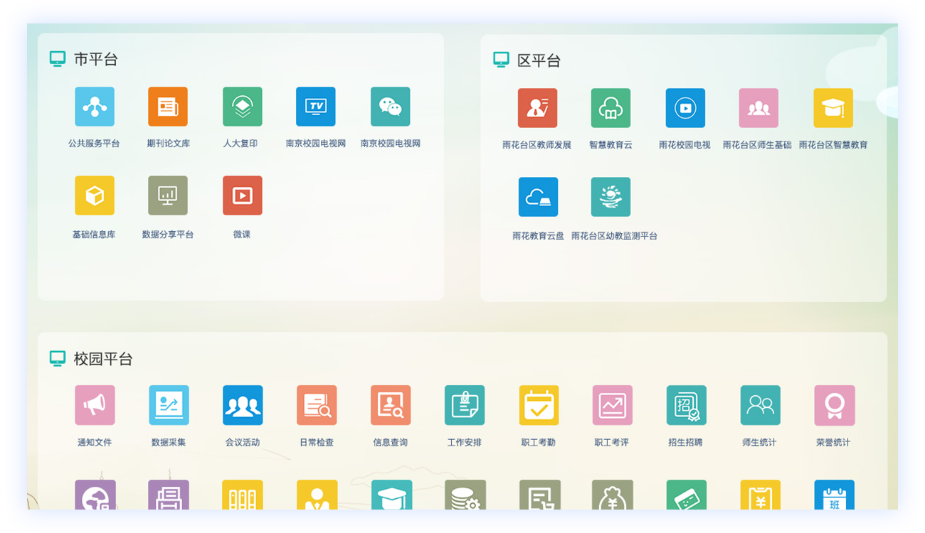 統一門戶平台是老(lǎo)師(shī)和(hé)學生(shēng)/家(jiā)長(cháng)訪問(wèn)的(de)入口,所有(yǒu)的(de)校(xiào)園應用都(dōu)通(tōng)過統一門戶平台進行訪問(wèn),避免不同的(de)應用要記住不同的(de)訪問(wèn)地(dì)址等問(wèn)題。包括移動端和(hé)PC端兩種訪問(wèn)方式。