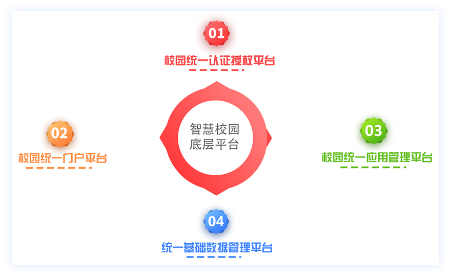 智慧校(xiào)園底層平台為(wèi)學校(xiào)搭建一套完備的(de)智慧校(xiào)園底層框架,為(wèi)校(xiào)園各場(chǎng)景的(de)業(yè)務提供基礎支撐,實現(xiàn)智慧校(xiào)園全場(chǎng)景、一平台、統一化(huà)管理(lǐ)。基礎平台由校(xiào)園統一基礎數據管理(lǐ)平台,校(xiào)園統一認證授權平台,校(xiào)園統一應用管理(lǐ)平台,校(xiào)園統一門戶平台構成。