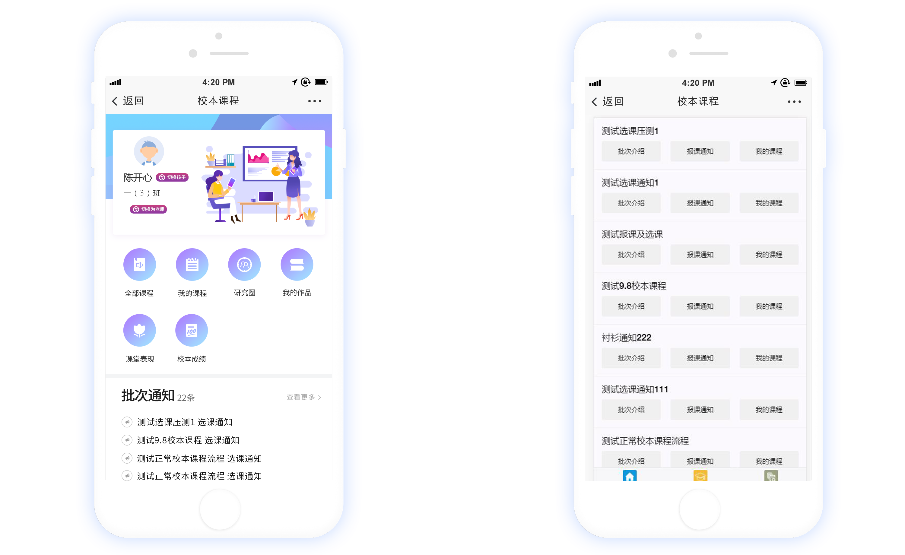 線上(shàng)創建課程,簡化(huà)報名登記程序;設定選課規則,避免無效報名;學生(shēng)選課,老(lǎo)師(shī)簽到,學生(shēng)評價,學生(shēng)作(zuò)品上(shàng)傳均可在線操作(zuò);統計(jì)結果可導出。