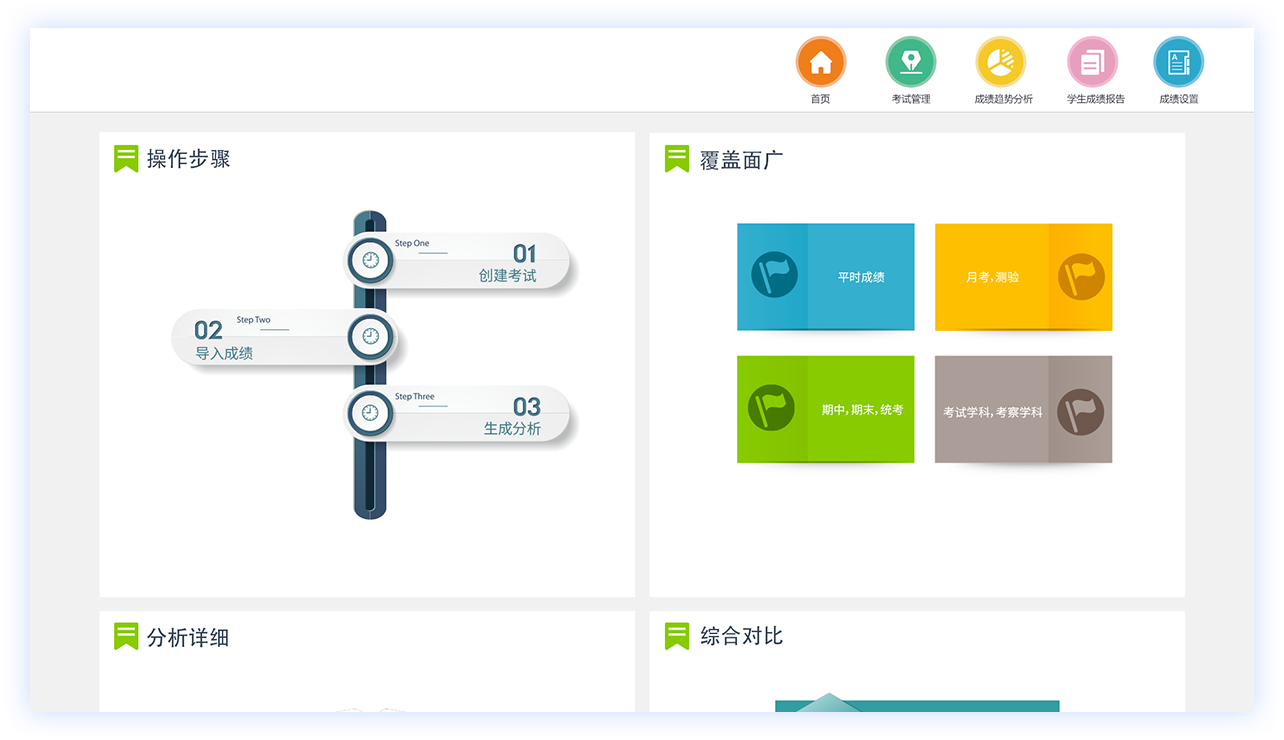 支持單科(kē)成績分析,總分分析,班級分析,年(nián)級分析,學生(shēng)個(gè)人(rén)分析。