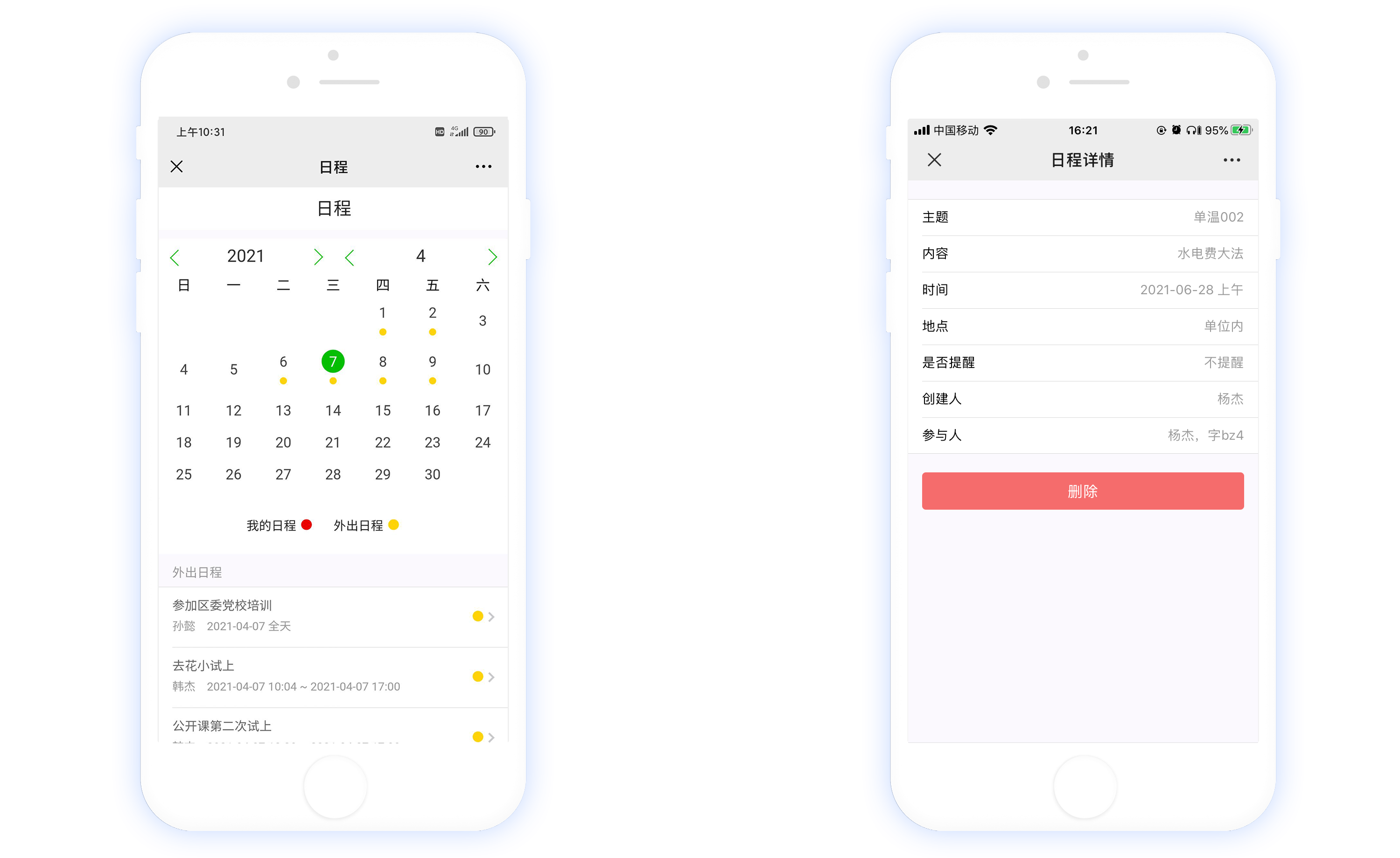 日(rì)程模塊主要為(wèi)了解決用戶的(de)日(rì)程安排查看(kàn)和(hé)日(rì)程提醒的(de)問(wèn)題,同時(shí)解決領導安排員(yuán)工(gōng)的(de)工(gōng)作(zuò),便于領導可以及時(shí)掌握員(yuán)工(gōng)的(de)動态。