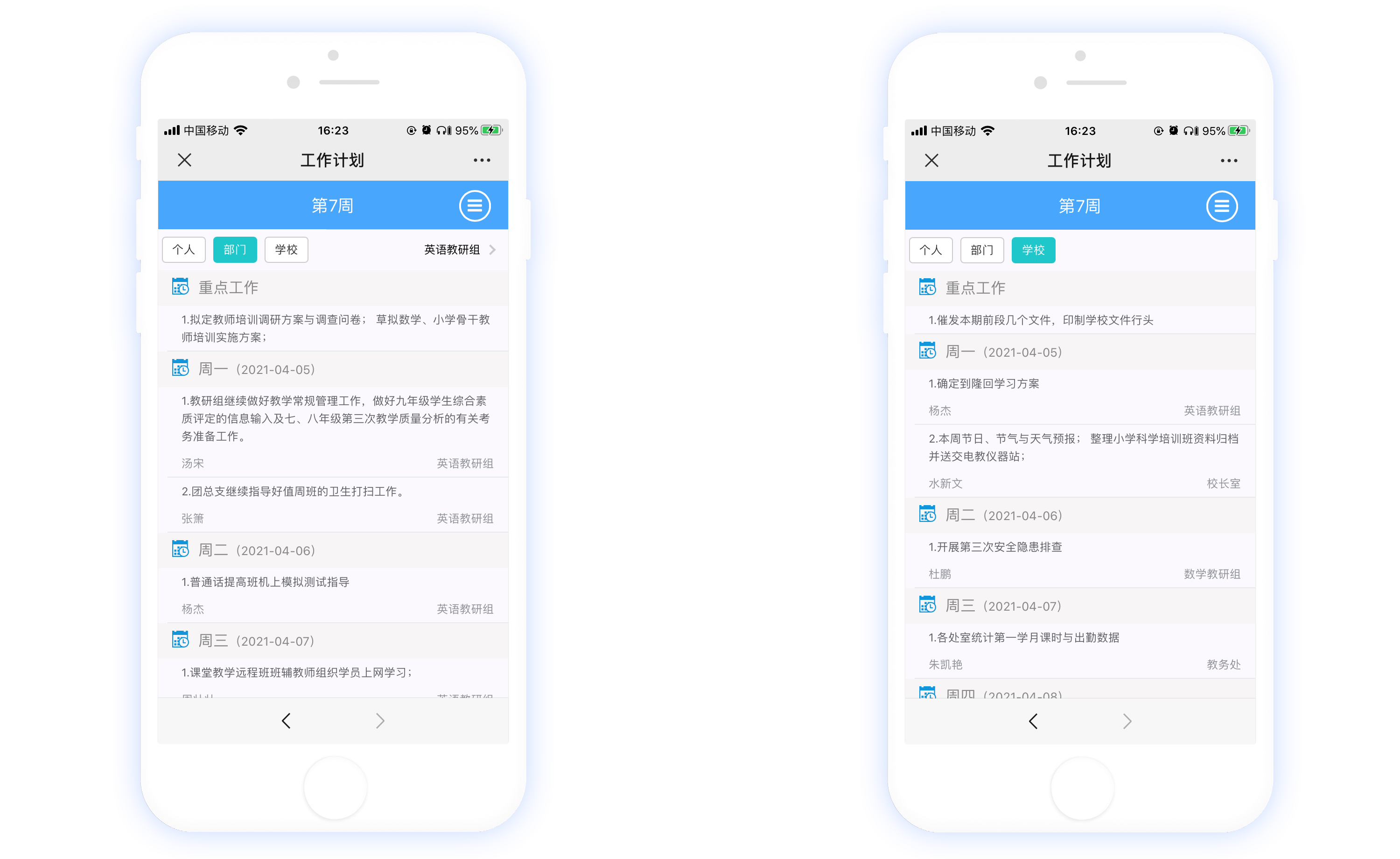 老(lǎo)師(shī)在日(rì)常上(shàng)下(xià)班時(shí)隻要利用手機(jī)進行打卡既能實現(xiàn)日(rì)常的(de)考勤,效率提高(gāo),體(tǐ)驗感更好(hǎo)支持個(gè)人(rén)、部門、學校(xiào)三級計(jì)劃的(de)制定、上(shàng)報、采用以及發布支持同步到個(gè)人(rén)日(rì)程中。