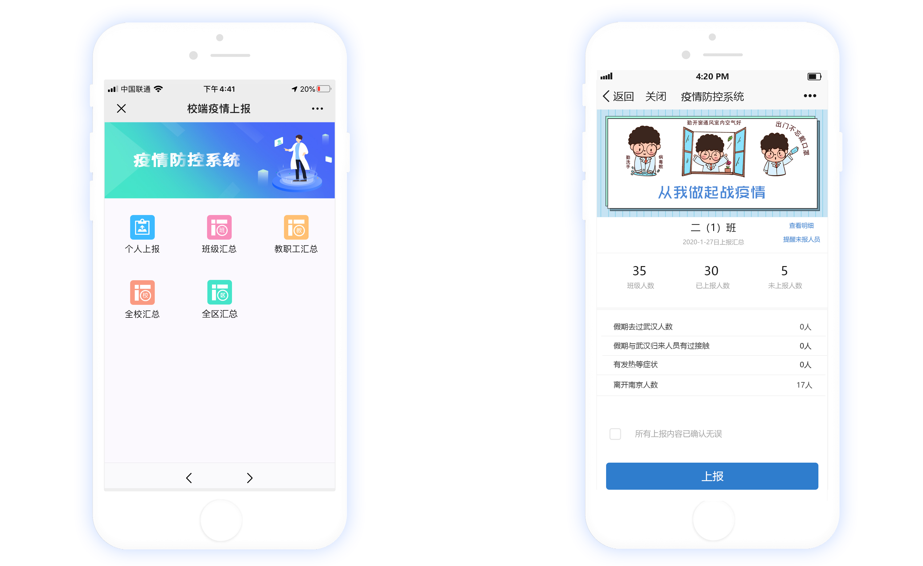 上(shàng)報教職工(gōng)健康信息,實時(shí)彙總把握詳情,支持導出相(xiàng)關人(rén)管名單,便捷高(gāo)效數據支持班級彙總,校(xiào)級彙總,區(qū)級彙總。