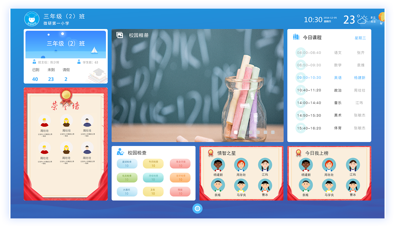 智能電(diàn)子(zǐ)班牌,能夠高(gāo)效的(de)傳遞緊急通(tōng)知、校(xiào)園公告、班級信息、考試安排、校(xiào)園活動等大量的(de)校(xiào)園信息,能夠融入更多的(de)科(kē)普知識,拓展學生(shēng)視(shì)野,提高(gāo)學生(shēng)的(de)互動積極性與管理(lǐ)能力、全面提升校(xiào)園整體(tǐ)風(fēng)貌與文(wén)明(míng)素養,打造數字科(kē)技(jì)智慧校(xiào)園生(shēng)活。