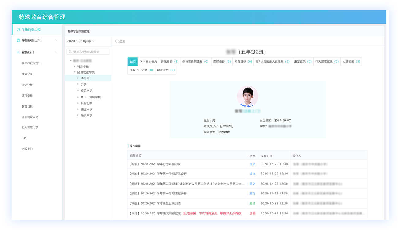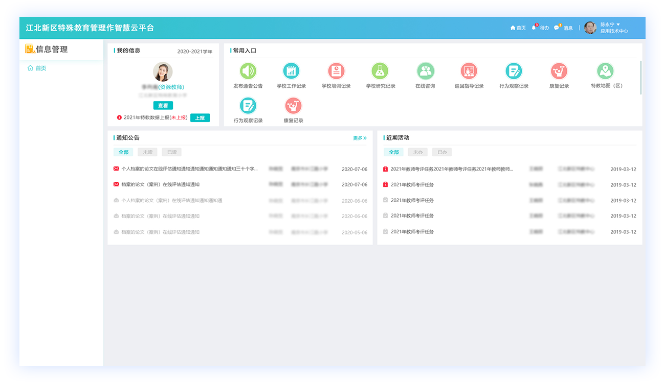在線咨詢、評估分析、課程安排、教育目标、康複記錄、行為(wèi)觀察記錄、送教上(shàng)門、巡回指導管理(lǐ)、學校(xiào)工(gōng)作(zuò)管理(lǐ)等。