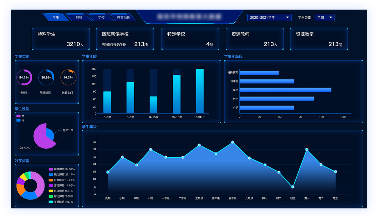 學生(shēng)按照(zhào)學年(nián)分類統計(jì)年(nián)齡、殘障類别、殘疾證明(míng)類型、殘疾程度、就讀方式等數據,學校(xiào)按照(zhào)學校(xiào)類型、所屬街(jiē)道(dào)等統計(jì)。結合各類數據的(de)可視(shì)化(huà)大屏展示,形成市(shì)/區(qū)/校(xiào)三級數據看(kàn)闆(指導中心,資源中心的(de)地(dì)圖分布展示、學生(shēng)信息圖表展示、全區(qū)資源中心教室資源圖表展示、教師(shī)資源圖表展示、研訓活動圖表展示等),按照(zhào)區(qū)域地(dì)圖形成特教大數據,展示區(qū)域的(de)學校(xiào)、街(jiē)道(dào)、學生(shēng)分布。